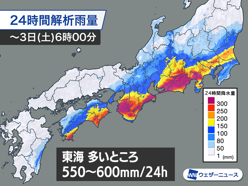 静岡県のアメダスでは24時間雨量が500mmを超えたところもあります。
