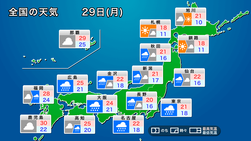 29日(月)の東日本は本降りの雨となり、今日ほど気温は上がらず暑さは落ち着く見込みです。外出の際は羽織る物をお持ちください。