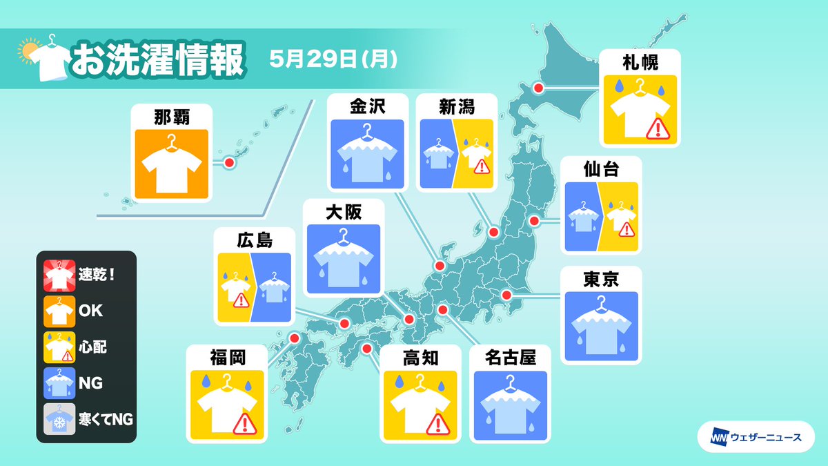 前線が本州付近に停滞する影響で、西日本と東日本は雨の降りやすい一日となります。雨が一時的に強まるところもあり、洗濯にはあいにくの天気です。