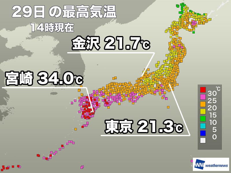 今日は前線の南側に入って日差しが届いた九州南部を中心に気温が上がり、宮崎県内では34℃を上回りました。一方で、山陰や北陸、関東は20℃前後の所が多くなっています。