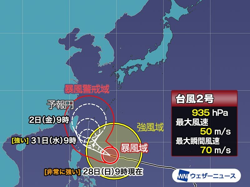 5月27日(土)15時現在、非常に強い台風2号(マーワー)はフィリピンの東で大型になりました。沖縄では既に波が高くなってきています。来週のはじめには沖縄の南海上に達する見込みで、その後の進路はまだ特定することが難しいため、こまめに最新情報の確認を。