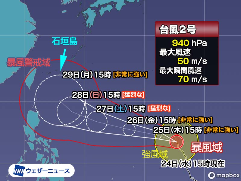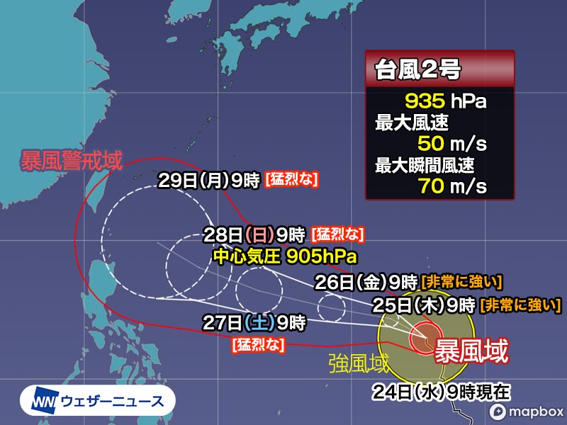 【台風情報】5月24日(水)午後、非常に強い勢力の台風2号(マーワー)はグアム島付近を通過中です。今後は猛烈な勢力に発達し、週末以降は沖縄方面に進むとみられます。早めの警戒が必要です。