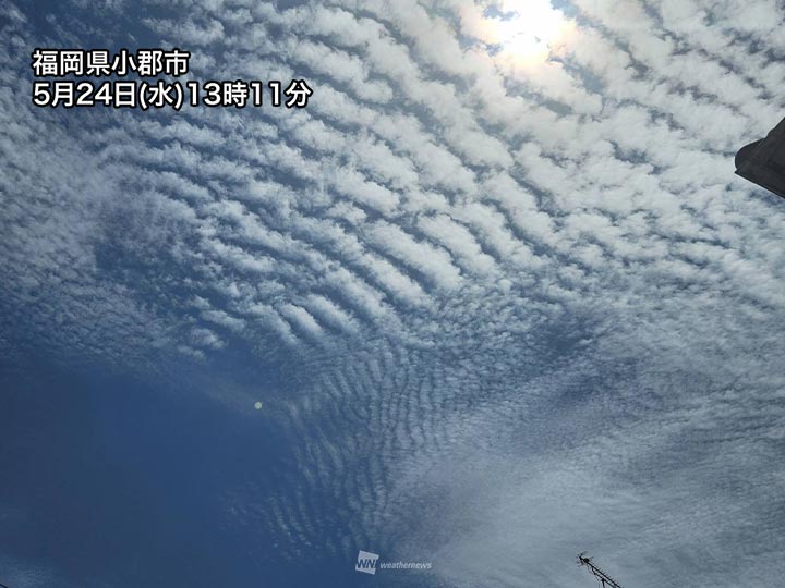 福岡県など九州北部では空の高い所に波打つような雲が広がってきました。上空の気圧の谷が近づいている影響です。今の所、大きな天気の崩れにはつながらない予想です。
