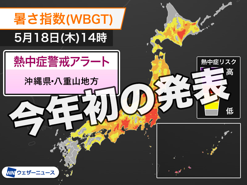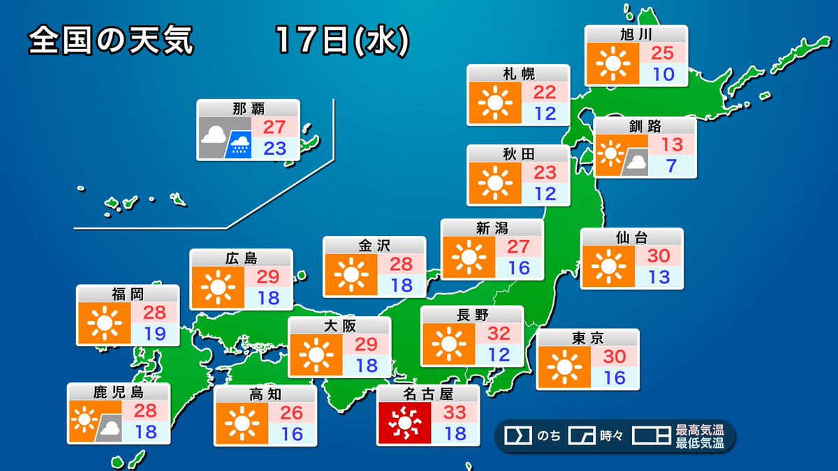 今日17日(水)は今年一番の暑さになるところが多く、関東内陸部では35℃以上の猛暑日となる可能性があります。東京や名古屋でも予想最高気温が30℃以上と真夏日になるため、こまめな水分補給や適切なエアコンの使用など、熱中症対策をしてお過ごしください。