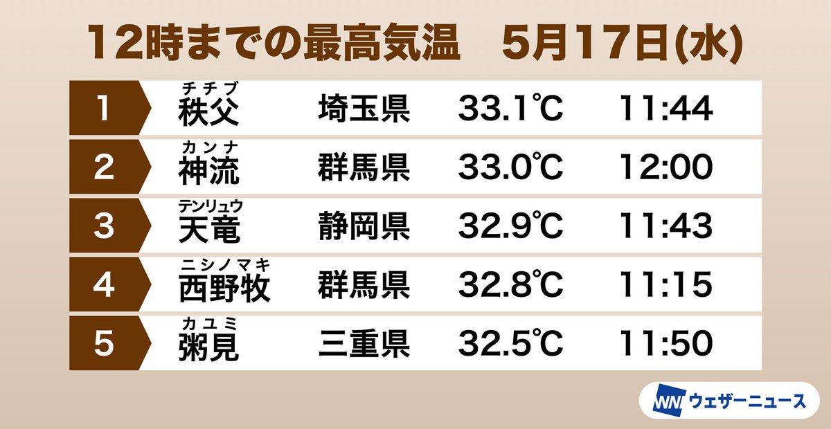今日12時までの最高気温は埼玉県秩父で33.1℃となり、真夏日地点数は120を超えました。