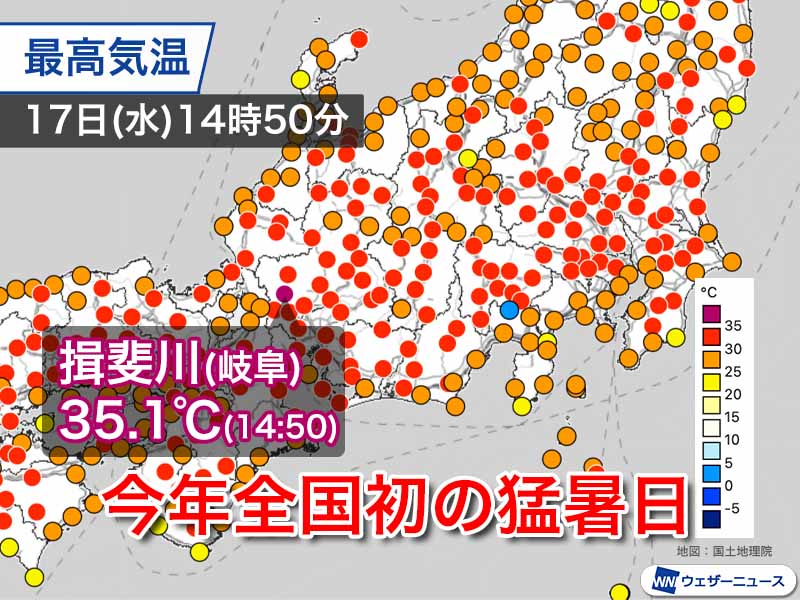 今日17日(水)は関東や東海など東日本や東北で気温が上がっています。特に内陸部では気温が高く、岐阜県揖斐川町では今年全国で初となる猛暑日を観測しました。
