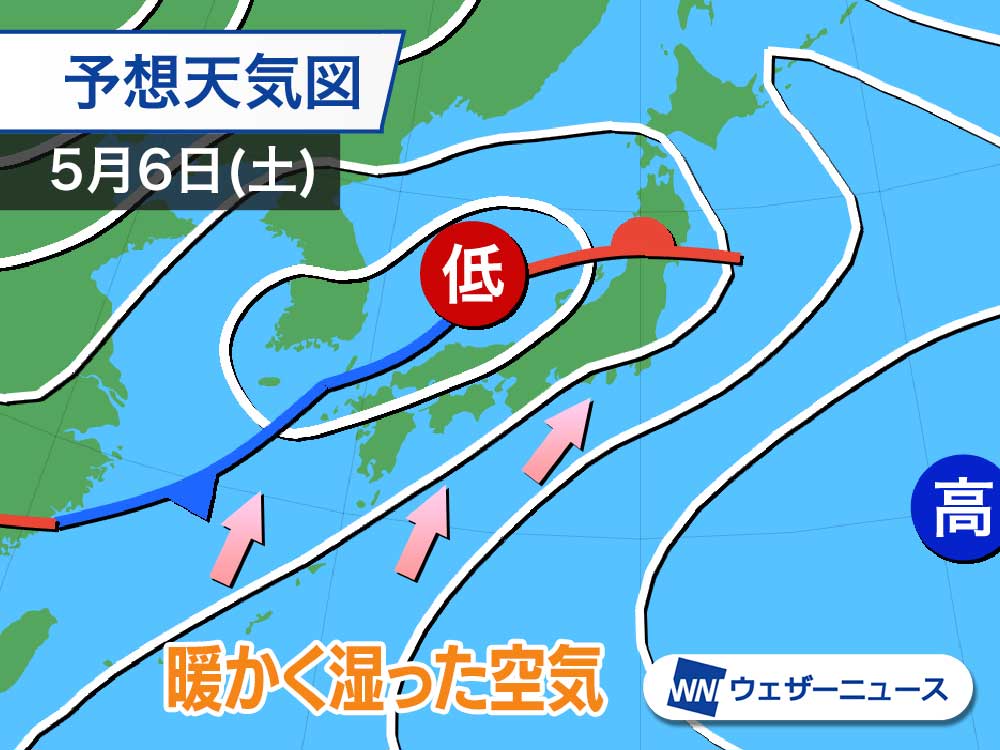 GWの連休終盤となる5月6日(土)頃は、日本付近を低気圧や前線が通過する可能性が高まってきました。
