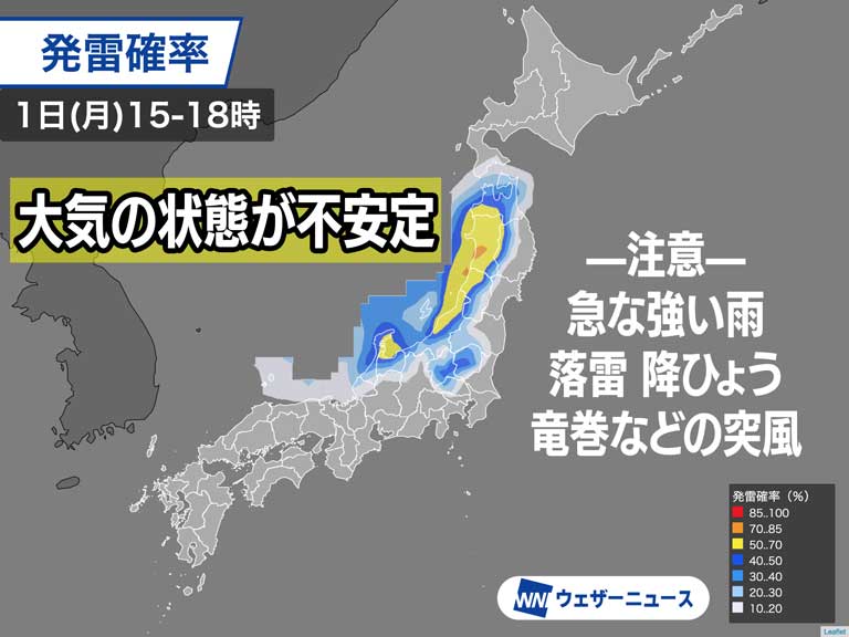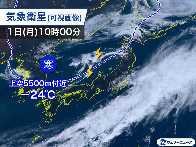 連休の谷間となる今日5月1日(月)は、日本列島の上空に寒気が南下するため大気の状態が不安定となります。晴れていても天気の急変に注意が必要です。