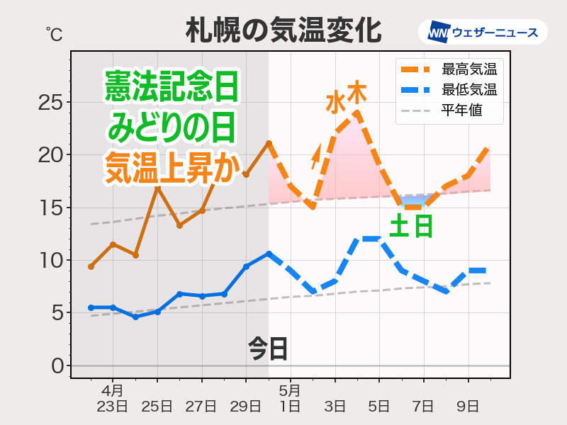 今年のGW期間は気温が平年並みに近い日が多いものの、後半は北日本や東日本などで気温が平年よりもかなり高い日がある予想です。