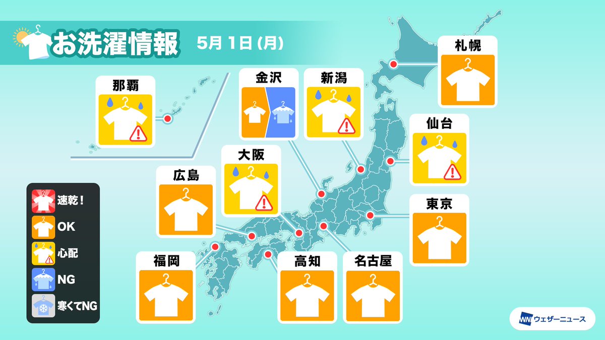 ただ、北日本や日本海側は天気変化に注意が必要です。午後は急な雨の可能性があるため、外干しをする方は早めに干して、空の様子が怪しくなる前に取り込んでください。