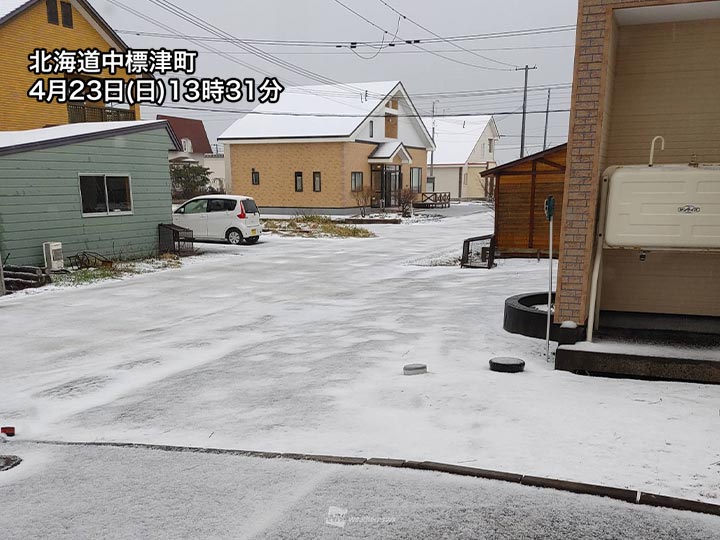 北海道は寒気の影響で大気の状態が不安定となり、雲が発達しやすい状況です。断続的に雨や雪が降っていて、霰(あられ)や雷を伴っている所があります。
