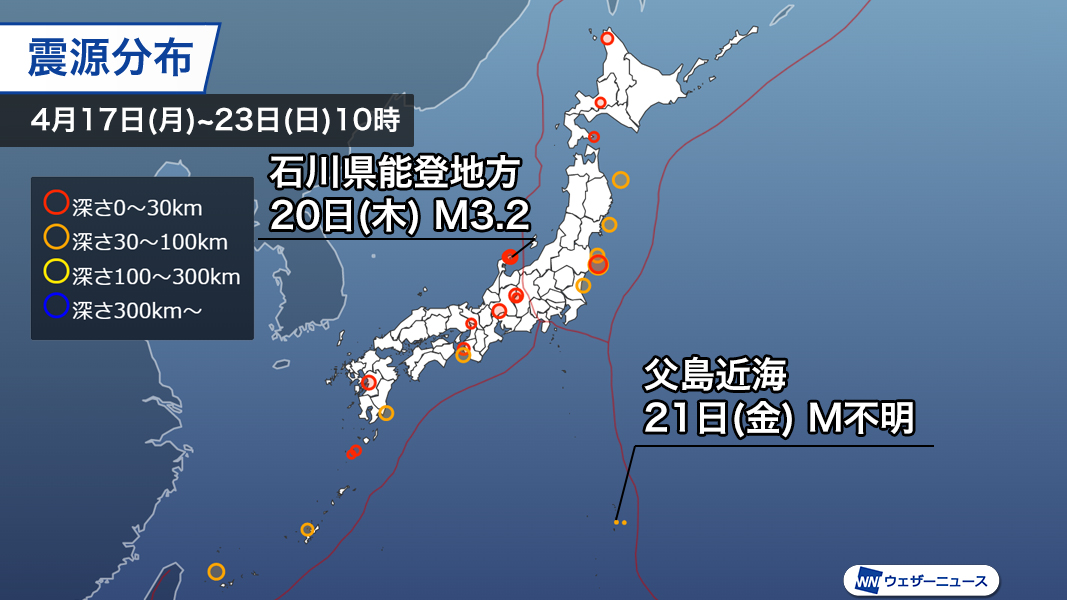 【週刊地震情報】小笠原諸島の父島近海では3月終わりから地震が頻発しています。21日(金)には最大震度4を観測する地震が発生しており、今後の動向に注意が必要です。