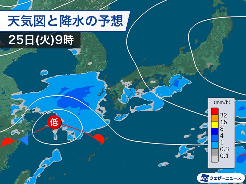 西から近づく前線の影響で、明日は西日本を中心に雲が広がります。火曜日から水曜日は全国の広い範囲で本降りの雨となり、局地的には強く降る所がある見込みです。