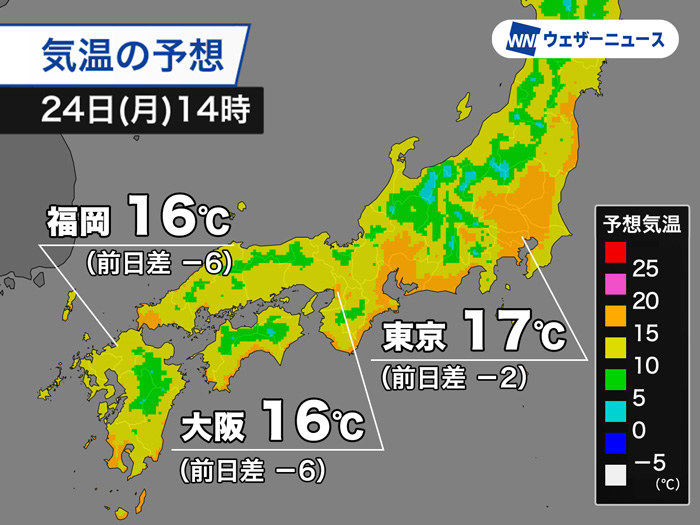 特に西日本では昨日と比べると大幅に低くなり、昼間でも少し肌寒く感じられるかもしれません。週末よりもワンランク暖かい服装がおすすめです。