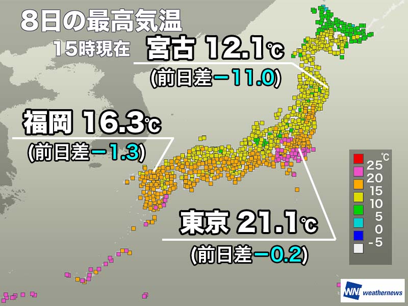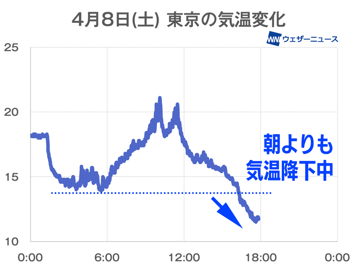 関東も夕方に降った雨とともに、気温が一気に下がってきました。東京では既に朝よりも寒くなっていて、最低気温を更新しています。