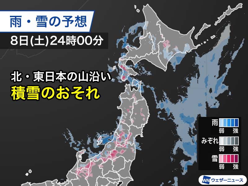 上空の強い寒気の影響で、北日本から北陸、関東を中心に雨や雷雨となっています。今夜以降は内陸部や山沿いで雪に変わり、積雪の可能性があるため注意が必要です。