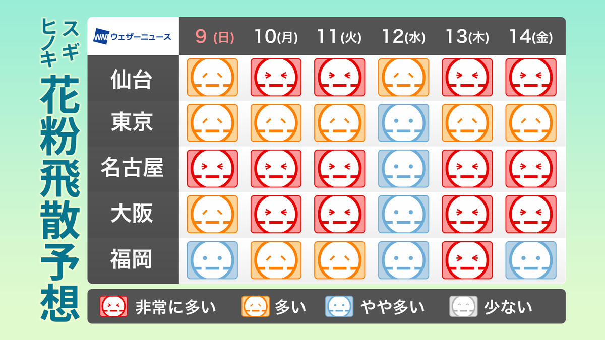 全国的に多い〜非常に多い飛散予想の日が多くなる見通しです。