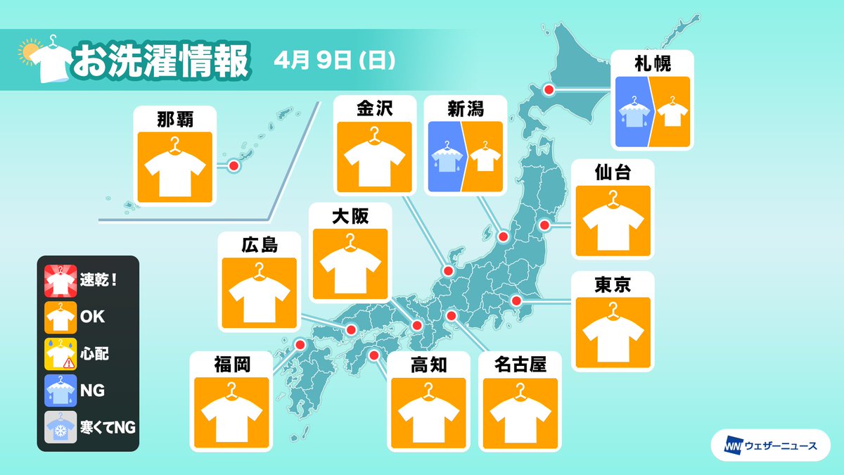 9日(日)は移動性の高気圧が日本列島を西から覆い、西日本や東日本は青空が広がります。北日本の日本海側は寒気の影響で午前中、雨や雪の残る所がある見込みです。