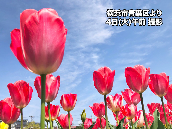この暖かさでチューリップの花が各地で大きく花開いています。青空を背景に赤や黄色のチューリップが映えています。