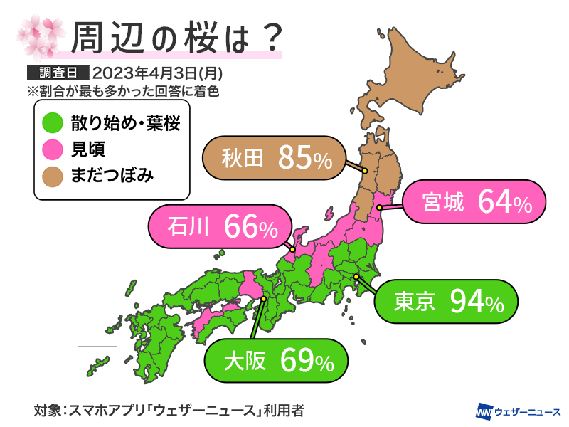 ウェザーニュースがアプリ利用者と行った調査によると、西〜東日本では広く「散り始め・葉桜」が過半数となり、今まさに桜が見頃のエリアは北陸〜東北南部であることがわかりました。
