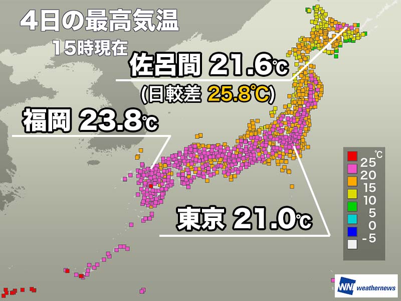 今日は高気圧に覆われて、全国的に晴れた所が多くなりました。朝に冷え込んだ内陸部も昼間は気温が上がり、気温差の大きな一日になっています。