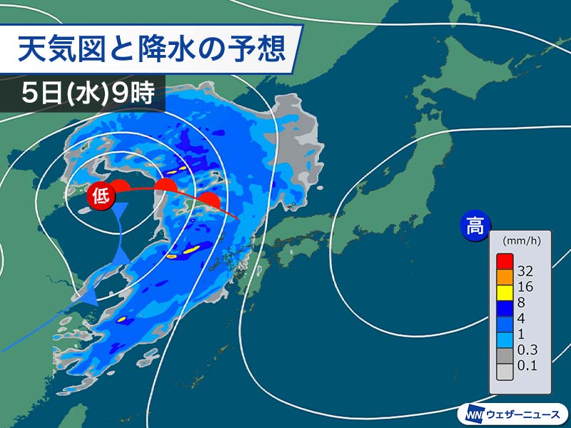 今日5日(水)は低気圧や前線の接近で西から天気は下り坂です。九州は朝から雨が降り出し、次第に雨の範囲が広がります。関東から北日本にかけても雲が多い一日です。