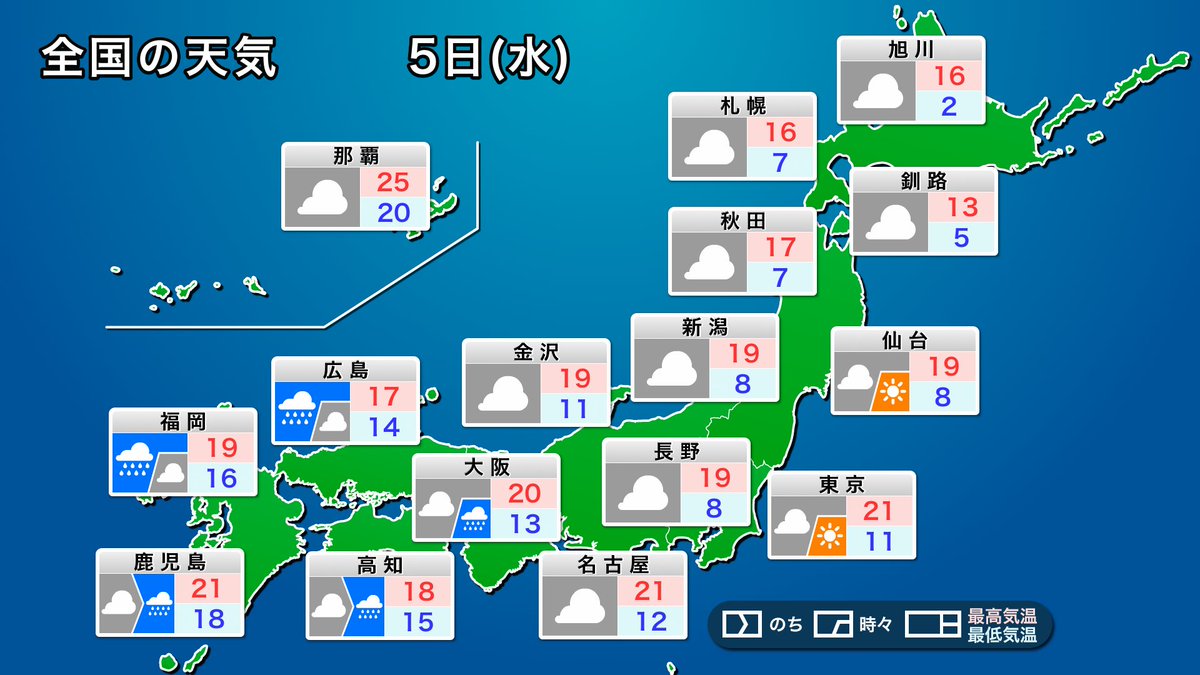 明日5日(水)は低気圧や前線の接近で西から天気は下り坂です。九州は朝から雨が降り出し、次第に雨の範囲が広がります。関東から北日本も雲が多い一日です。