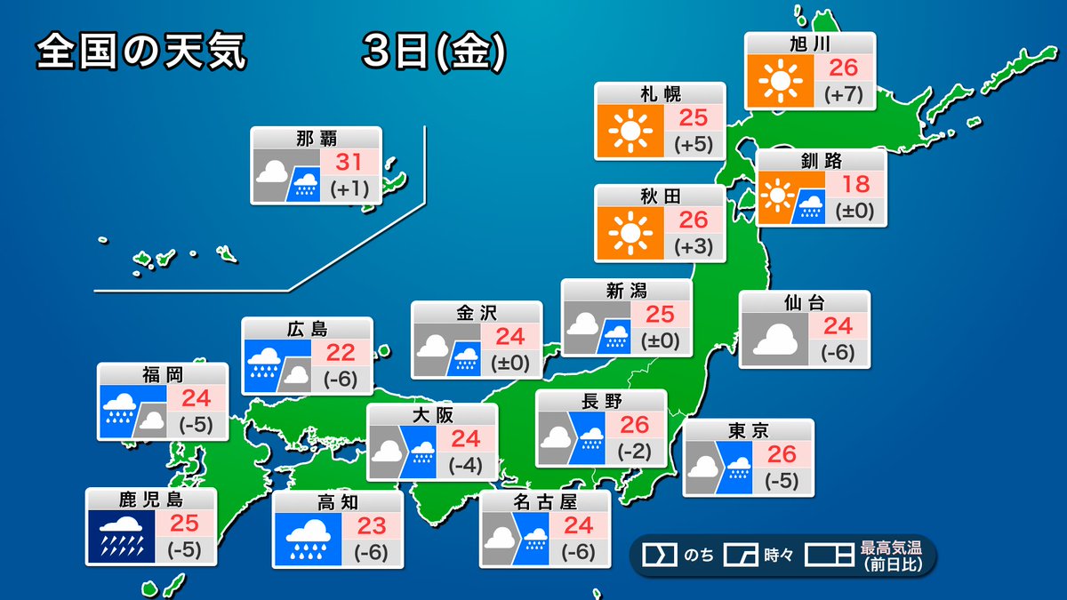 今日3日(金)は梅雨前線が再び北上し、西から雨の範囲が拡がります。九州には発達した雨雲が次々と流れ込むため大雨となり、河川増水や土砂災害に警戒が必要です。