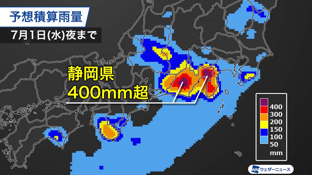 東海から西日本の太平洋側は断続的に激しい雨が降っています。特に明日7月1日(水)にかけては静岡県の多い所で400mm以上の大雨のおそれがあり、土砂災害や河川の増水などに厳重な警戒が必要です。