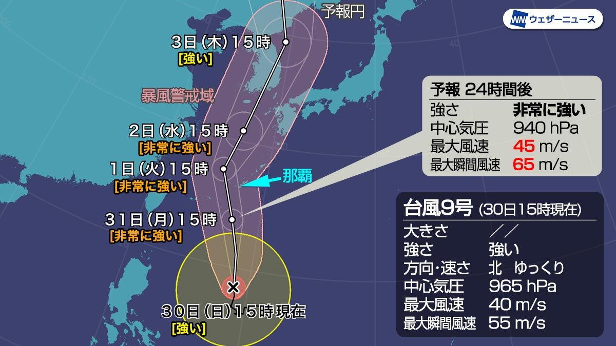 大型で強い台風9号(メイサーク)が北上し、沖縄の一部は早くも強風域に入っています。今夜遅くから明日1日(火)早朝にかけて「非常に強い」勢力と発達のピークで沖縄本島地方に最接近。風速70m/sの記録的暴風のおそれがあります。