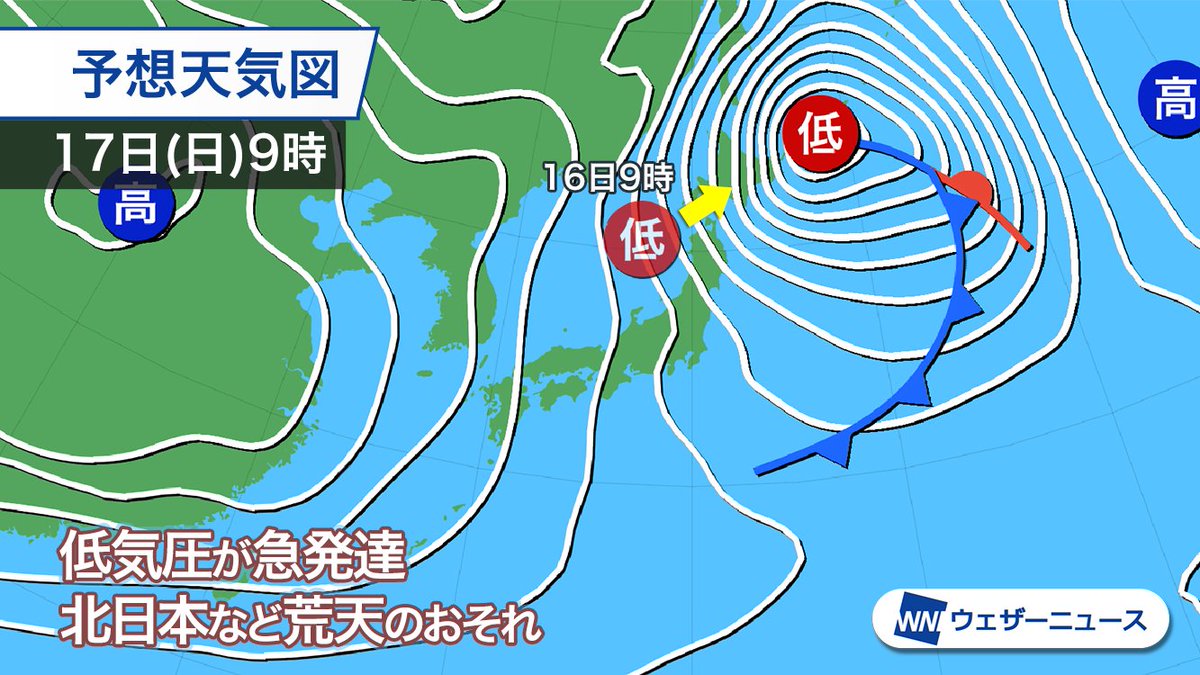次の週末の16日(土)〜17日(日)にかけては、いわゆる「爆弾低気圧」級の急発達をする低気圧が北日本を通過する見通しで、猛吹雪となるおそれがあります。