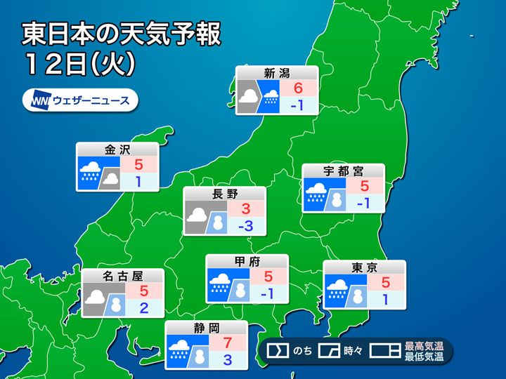 連休明けの明日12日(火)は、未明から夕方にかけて関東や関西など広範囲で雪や雨が降る予想です。