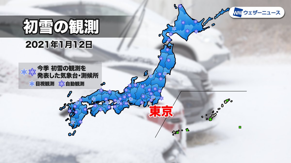 今日12日(火)、気象庁は東京で初雪を観測したと発表しました。平年より9日遅く、昨年より8日遅い初雪観測です。