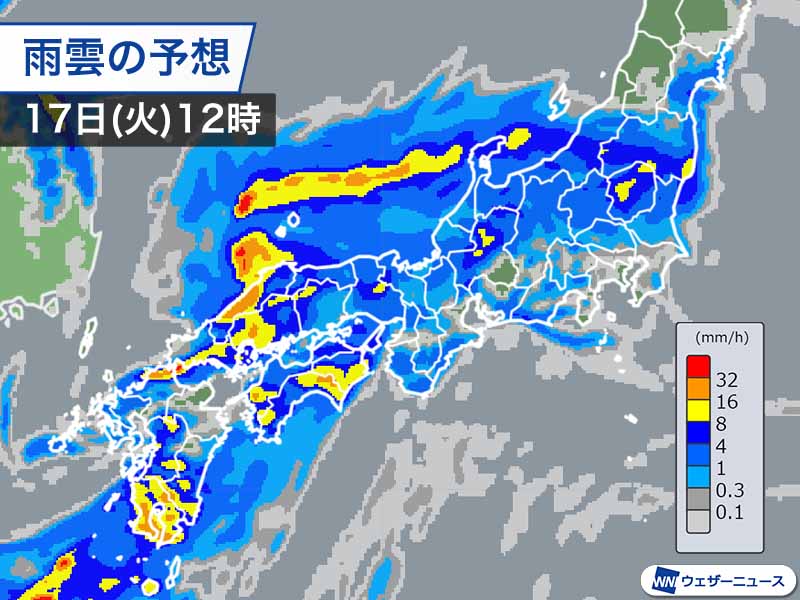 今日17日(火)は秋雨前線による雨の範囲が広がり、西日本から東日本にかけて激しい雨の降るおそれがあります。関東でも一時的に土砂降りの雨となる見込みです。