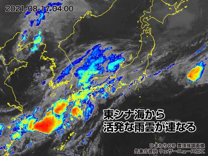 東シナ海には発達した雨雲が連なり、これまでに記録的な雨が降った地域で再び大雨となるおそれがあります。