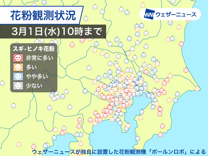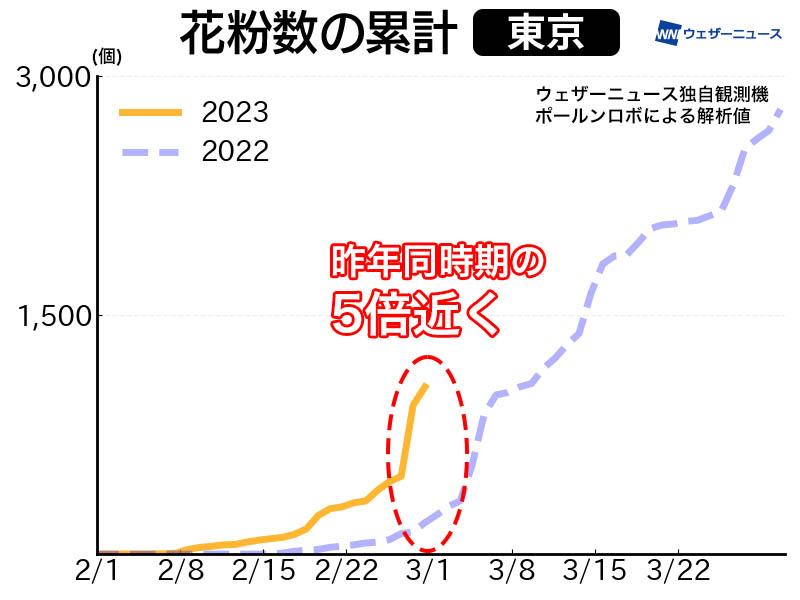 今日の関東は午前中から花粉の飛散量が多くなっています。ここ数日の強風や気温の上昇によって大量飛散が続いており、累計の飛散数は昨年同時期の5倍近くに達しました。