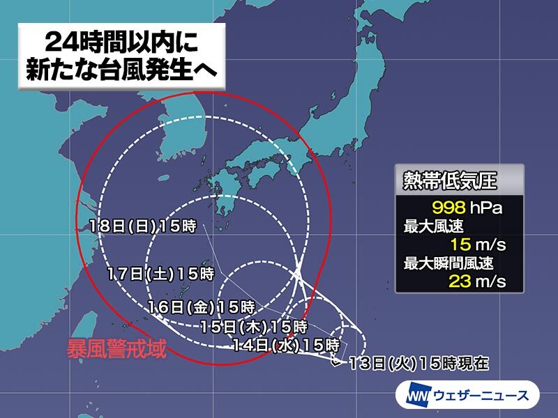 9月13日(火)15時現在、日本の南で発達中の熱帯低気圧について、気象庁は24時間以内に台風に発達する見込みとの情報を発表中です。