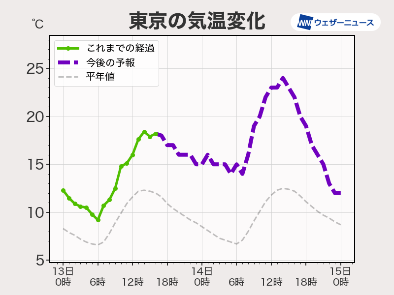 明日の関東は今日以上に気温が上がり、暖かいを通り越して少し汗ばむ陽気となります。関東で今年初の25℃以上の所があるかもしれません。