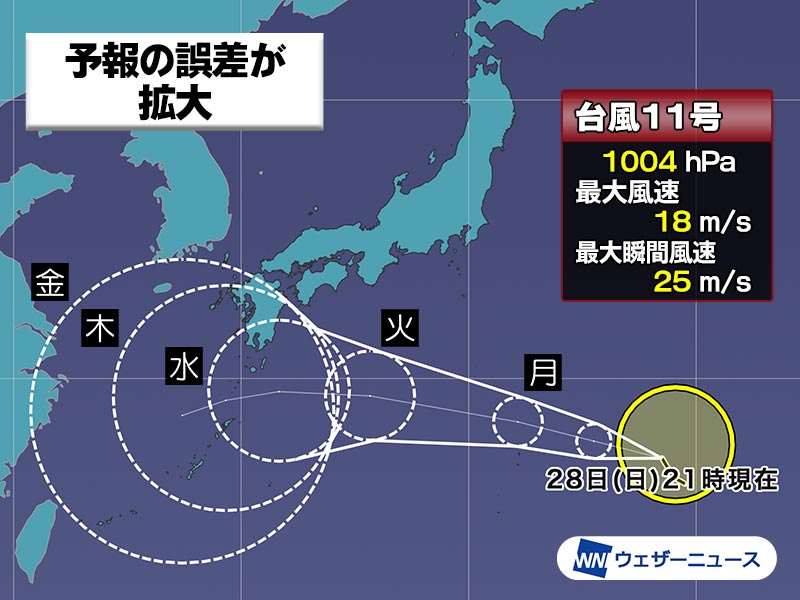 予報の誤差が拡大し、5日先の予報円は直径1300kmと広大になっています。