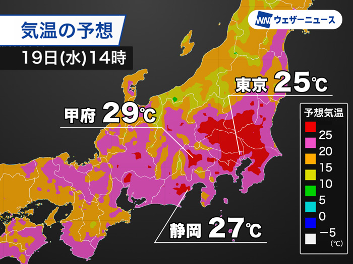 上空には暖かい空気が流れ込み、今日19日(水)は日差しの届く関東甲信や東海などで25℃を超えるところが多くなります。