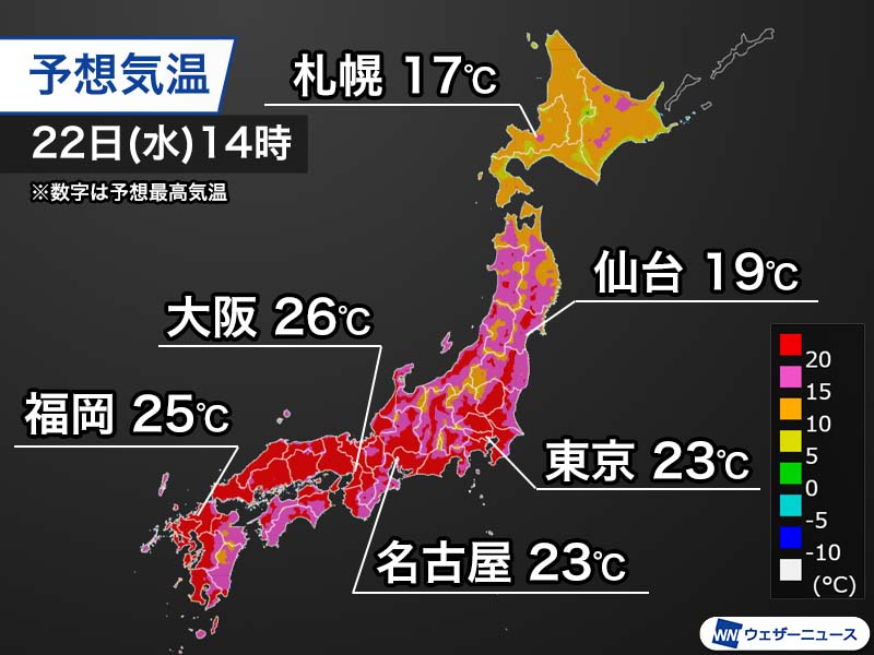 明日は今日以上に暖かな空気が流れ込む上、日差しが戻る関東以西で気温が上昇し、初夏の陽気となる見込みです。大阪は25℃以上の夏日の予想で、過去最も早い記録を更新する可能性があります。