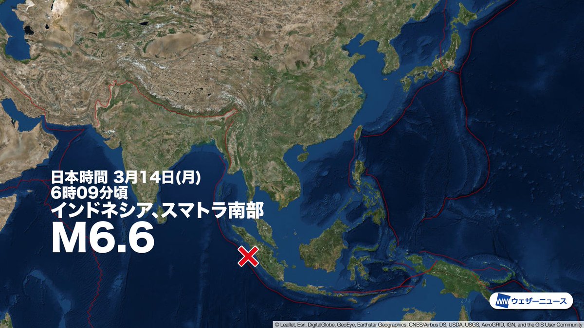 震源地はインドネシア付近(インドネシア、スマトラ南部)で、地震の規模はM6.6と推定されます。