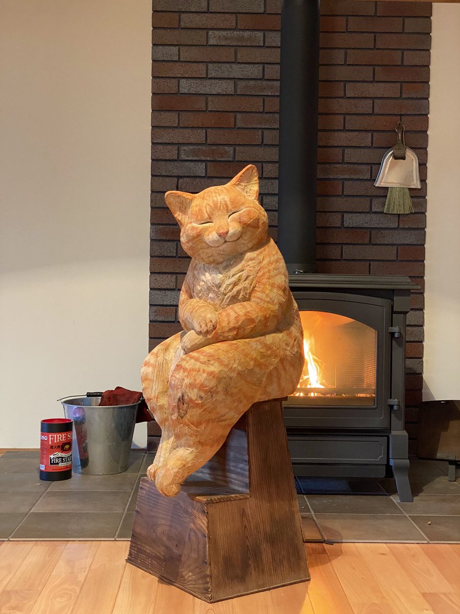 彫刻と猫。仲良くぬくぬく。