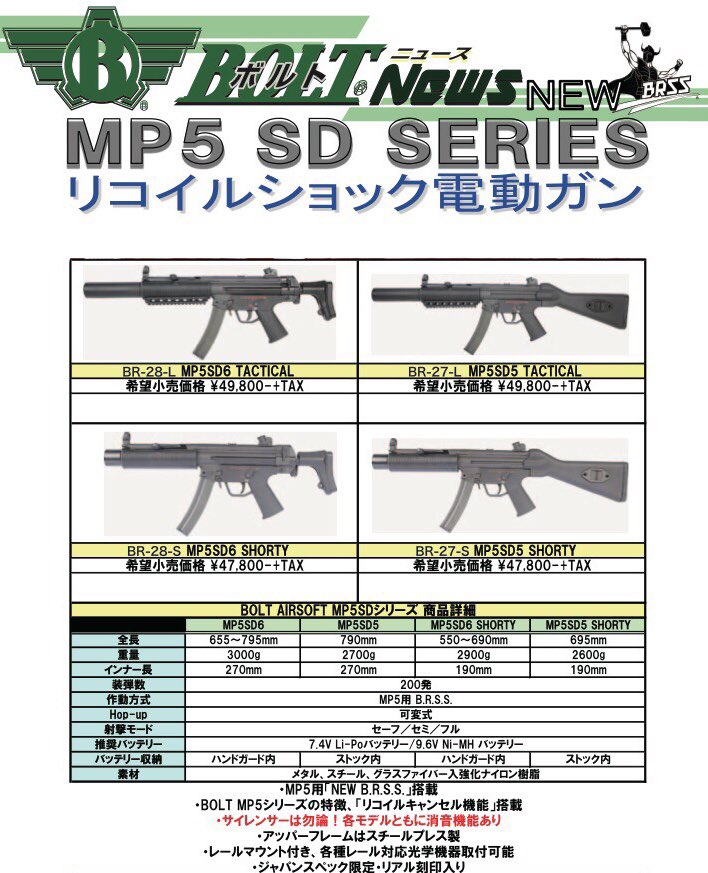 BOLT MP5 SDシリーズ、4種類同時発表されました!固定ストック/伸縮ストックバージョン共にロングサイレンサー/ショートサイレンサーがラインナップされます。今年末発売予定です! #BOLTAIRSOFT