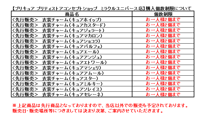 明日3月30日より販売を予定していた「<先行販売>衣装チャーム 全15種」は予定どおり、明日のオープン11時より販売致します。こちらの商品はお一人様各種2個までの個数制限を設けさせていただきます。
