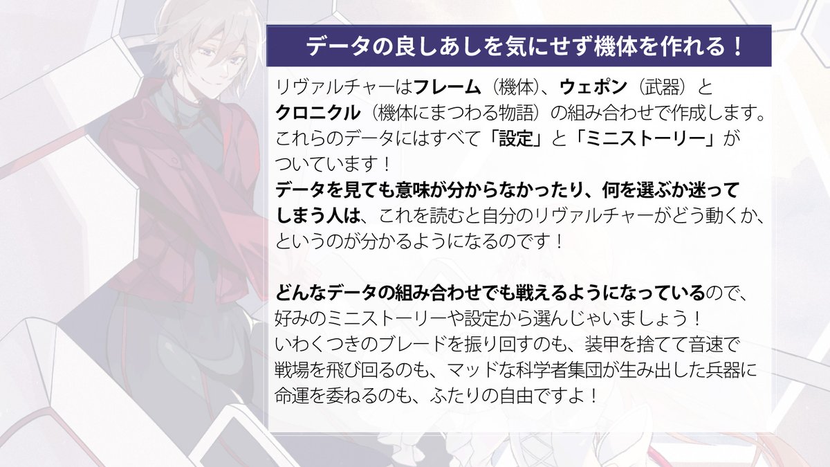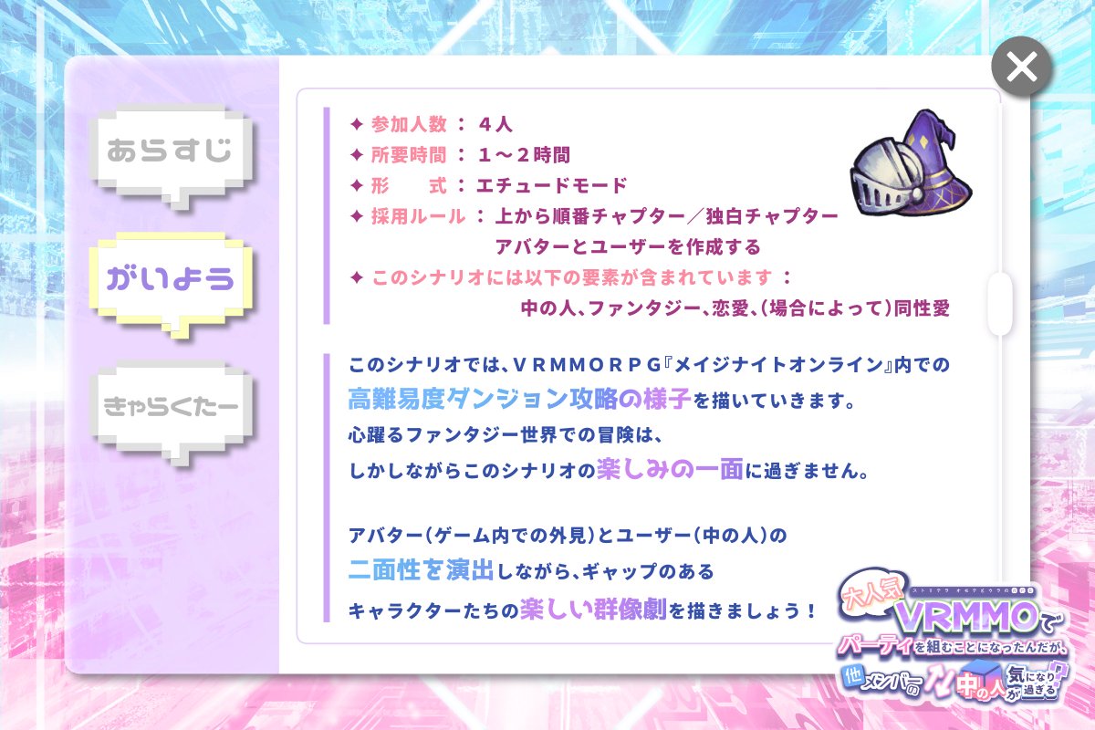 アバターと中の人のギャップのあるキャラクターとなって、その二面性を描きながら楽しんでください!