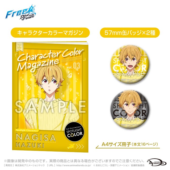 渚のことにスポットライトを当てた16ページの冊子「キャラクターカラーマガジン」と、2パターンの表情を切り取った「57mm缶バッジ(2個)」をセットにしてお届けします。今まで知らなかった一面が見つかるかも?!