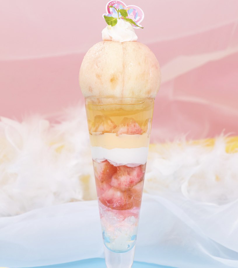 愛知県名古屋市大須観音駅近くにあるお店「ユメリラ」の、桃を丸ごと1個乗せ、桃ゼリーなど中にも桃が詰まった桃尽くしのパフェ「桃色乙女」✨