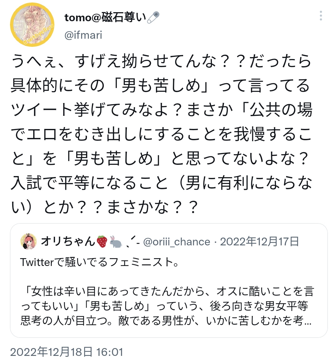フェミニストが若くてモテる女説、そういうの度々話題になるけど…そんなのどうでもよくて、、。婚活してる時に自分に見合った人が現れなかったのがフェミニストになったきっかけの人とか彼氏やセフレがいた人とかが赤の他人の女性に「ちんよし」「棒好き女」「飯炊きオナホ」と罵るのが意味わからん。