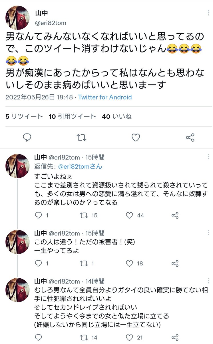 そんなのがフェミニズムやら人権を語るのやめてほしい。恥ずかしい。被害にあったら、無関係な男児の被害を望むことが正当化される?…ただの呪いの塊。